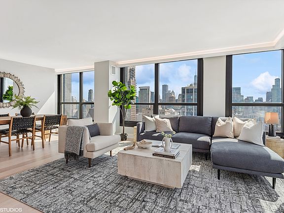 Welcome to your very own paradise in the sky! This exquisite 41st-floor residence in Gold Coast's Newberry Plaza offers an unparalleled living experience with expansive, unobstructed southwest views. As you step inside, you'll be greeted by a formal entryway that sets the tone for the luxury that awaits. This custom-designed 3 bed, 3 bath floor plan is bathed in sunlight. The spacious living and dining area is perfect for both relaxing and entertaining. The kitchen is a chef's dream, featuring custom quartz countertops and a jaw-dropping island with 4-inch-thick bevel edge and matching backsplash. European frameless cabinetry adds a sleek, contemporary touch complemented by above cabinet, backsplash, and lower cabinet lighting. High-end appliances, including a Subzero fridge, wine fridge, Wolf induction oven, Bosch dishwasher, Sharp microwave drawer, and an Elkay sink with accessories, make this kitchen a true culinary haven. Throughout the home, you'll find 7.5-inch Nordic Brazilian white oak flooring, custom ambient lighting, electric shades with blackout features in the bedrooms, 84-inch single panel doors, and dimmable switches. The master suite is a true retreat, offering a custom-built closet and a spa-like bath featuring a floating vanity with quartz countertops, European cabinets, under cabinet lighting, Kohler fixtures, heated floors, floating toilet, and a digitally controlled Kohler shower create a luxurious oasis where you can even program your morning routine from bed. The second master bedroom is equally impressive, with space for a king-sized bed, built-out closet and bath featuring heated floors, white shaker cabinets, quartz countertops, Kohler faucet, with custom glass shower, rain head with a hand-held and Toto toilet. The spacious third bedroom is conveniently located across from the third full bath, which boasts a floating vanity, heated floors, quartz countertops, under cabinet lighting, a backlit LED mirror, bathtub, Toto toilet, and Kohler fixtures. Practicality hasn't been overlooked either, with full-size in-unit laundry, coat closet, utility closet, an oversized pantry, and two storage units on the same floor to complete this dream home. This is a unique opportunity to live in a meticulously designed and thoughtfully appointed residence with breathtaking views. In the heart of the Gold Coast, you'll experience the epitome of city living. It's not just a place to reside; it's a lifestyle to savor. Welcome to a world of sophistication, convenience, and leisure.