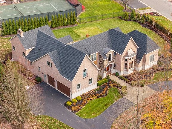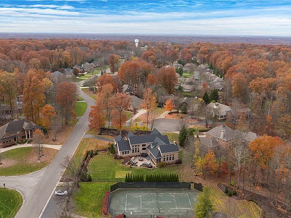 Experience refined living in this exceptional custom-built residence, offering 4 bedrooms & 4 1/2 baths, gracefully situated on .71 acre corner lot. From the moment you arrive, the circular driveway & stately façade set the tone for the elegance & craftsmanship that define this remarkable home. Step through the grand entrance into a two-story foyer, highlighted by a floating curved staircase a custom stained-glass window that serves as a stunning architectural centerpiece. The foyer opens to a spacious, two-story glass-walled grand salon with marble-flooring, while the formal dining room, with a butler's pantry, sets the stage for gracious entertaining. The two-story great room impresses with soaring ceilings, dual window walls, custom cabinetry, gas fireplace, & custom draperies creating the perfect balance of comfort & grandeur. The two-story home office is richly appointed with custom-built bookcases, coffered ceilings, & wood paneling throughout, offering a distinguished setting for work or study. The first-floor primary suite is a true private retreat, featuring, a gas fireplace, custom California Closets, & a luxurious marble spa bath with a walk-in shower & clawfoot soaking tub. At the heart of the home, the gourmet kitchen showcases high-end finishes, large walk-in pantry.. The first-floor laundry room provides built-in cabinetry, sink, & ample storage. The second floor features a guest suite with an en suite bath, as well as two additional bedrooms connect by a Jack & Jill bath. A spacious bonus room offers a versatile haven ideal as playroom, media space, or private retreat for any member of the household. The finished lower level is designed for recreation and wellness, featuring a wet bar, yoga room, sauna, steam shower, ample storage, & a secure storage closet. Outdoor living offers a covered veranda, new patio, outdoor fireplace, outdoor kitchen, 9 person hot tub & outdoor TV, perfect for year-round entertaining.