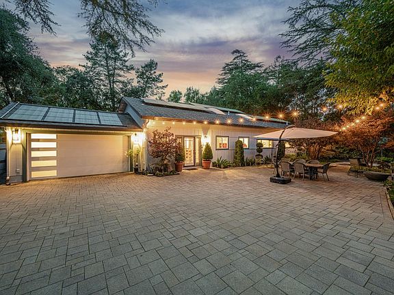 Park-like grounds surround renovated, single-level Mid-century home on a hidden lane one block from downtown. Approx. .85 acre includes adjoining parcel. Lush retreat features fruit trees, flowers, topiary and shaded sitting areas that flow between patios, gardens with fountains and a sparkling pool. Gated, pavered drive leads to the light-filled 3BD/3BA home with vaulted ceilings, skylights, and bamboo-style floors. Open plan with gas fireplace and walls of glass connects seamlessly to the outdoors. Modern kitchen situated for entertaining indoors or out: ample slab counters, flat-panel cabinetry, stainless appliances, dual sinks, and skylit butler's pantry. Large primary suite enjoys a sitting area, built-ins, full bath with walk-in shower and outdoor access. The guest wing has two generous bedrooms with built-ins, picture windows and an updated full bath. Raised beds for produce and cut flowers, chicken coop, outbuilding, full outdoor bath. Efficiency: new solar/29 panels, 9 Enphase batteries (warranty to 2034), new electrical panel + public utilities. Stroll to grocery stores, tasting and dining and Sonoma Valley Regional Park. Minutes to Sonoma Plaza, 1+/- hour to San Francisco.