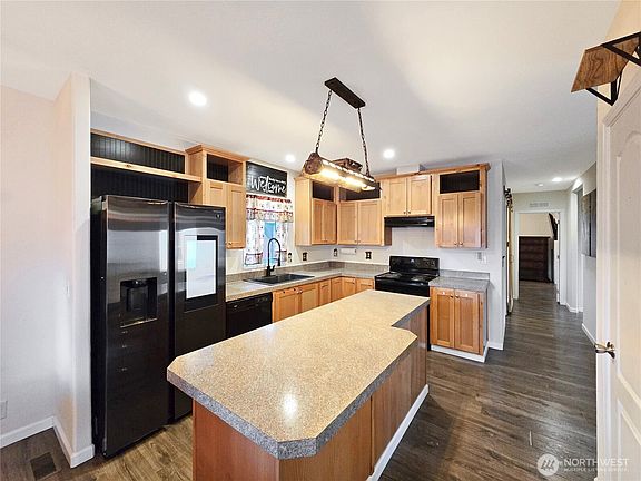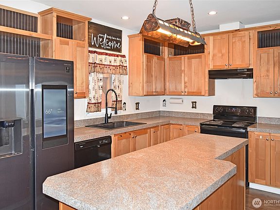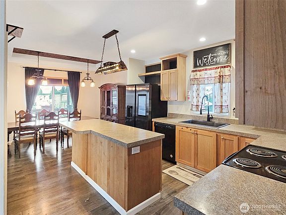 Welcome to the perfect blend of style & energy efficiency in this beautiful 2020 manufactured home located in an all-ages park! This thoughtfully designed 3-bed, 2-bath home features a spacious open-concept Kit, DR, and LR—ideal for hosting dinner parties & everyday living. You’ll love the modern black appliances, large center island, and recessed ceiling in the dining area that adds a touch of elegance. The interior showcases modern tape-and-texture walls, upgraded interior doors, upgraded insulation, hardwood-like laminate flooring, & custom valances. Enjoy covered parking and additional storage for your tools. This move-in-ready home is perfectly located near JBLM, shopping, schools, restaurants, parks, & more—Welcome Home!