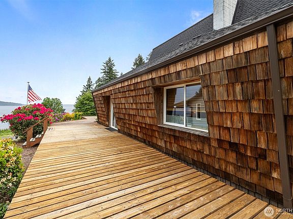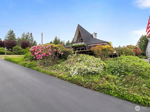 Tucked into a storybook setting, this charming A-frame cabin-style home offers private beach access where you can comb for driftwood, oysters, shells, and other seaside treasures. The beautifully manicured yard gives way to stunning mountain and bay views from the spacious deck—perfect for morning coffee or evening wine. Shake siding, warm wood paneling & crackling wood stove inside add rustic charm, while a cozy wet bar invites relaxation. Upstairs, a bonus room opens to a sweet little veranda. It's just the spot to savor the views and your favorite beverage. This is a rare coastal gem that feels like vacation every day. Come and live in peace and quiet or just visit it on the weekends. You know you've earned it! (New 50 year roof in 2024)
