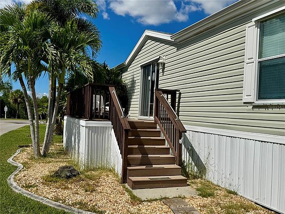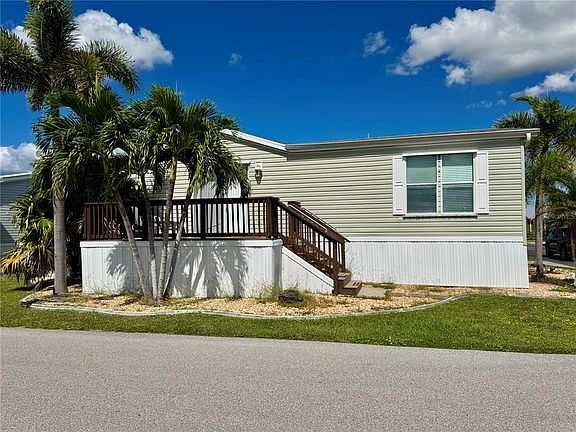 Great opportunity to live in a desirable 55+ waterfront community! Located in Eagle Point, on scenic Alligator Creek in Punta Gorda, this furnished 2-bedroom, 2-bath home (built in 2005) offers comfort and coastal charm. Enjoy relaxing on your porch surrounded by palm trees, or make use of the separate workshop/storage area for hobbies and extra space or venture outside to ride your bike or walk around the relaxing waterfront area. Cost comparison where can you live in Fl, keep a boat in the storage area on site with a community boat ramp with access to Alligator Creek and beyond!!! As a park share community buyers purchase 5–20 shares at $1,000 each, which reduces quarterly dues and is refundable upon resale. HOA dues include water, sewer, trash, recreational facilities, and road maintenance. Eagle Point is an active waterfront community offering a variety of amenities and activities, including a heated pool, social hall with Wi-Fi, library, recreation room with card and pool tables, fire pit area, bingo nights, large grilling area, and a community dock perfect for fishing, gathering with friends or launching your kayak on alligator creek. Cost comparison where can you live in Fl, keep a boat in the storage area on site use the community boat ramp with access to Alligator Creek and beyond!!!Experience the best of Florida living!