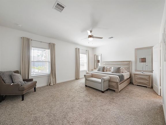Modern Series 2-Story 2021 yr built home on a large corner lot in the highly sought after community of Foster Ridge. 5Bed/3Bath. Zoned to The Woodlands feeder schools. Rentable Clubhouse with pool, playground, walking trails w/ doggie stations and a large Fishing Pond & Picnic. Minutes from The Woodlands, Shopping, State Park, Splash pads, Trails, and MORE! The kitchen features Quartz countertops, endless cabinet space, walk in pantry, and a large island with a deep farmhouse sink. The Kitchen opens to the dining and living area that features a beautifully customized electric fireplace with direct view of the large 30x15 covered patio with surrounding raised garden beds with included patio furniture. Primary Bedroom is on the first floor with separate tub and shower in ensuite leading to large customized walk-in closet. Upstairs you will find 3 bedrooms Plus game room!Refrigerator included. Room sizes approximate.