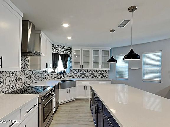 Stunning modern remodel with custom designer finishes throughout! Roof & AC only 4 years old!! This 3 bed, 2.5 bath home features an open concept layout, sleek wood-look tile flooring, and a show-stopping kitchen with quartz countertops, stainless steel appliances, bold patterned tile backsplash, glass-front cabinets, and a massive island with bar seating. The main-level primary suite includes French doors to the backyard, a large walk-in closet, and a luxurious bath with freestanding tub, dual sinks, and a glass-enclosed shower. Upstairs you'll find two additional bedrooms and a beautifully updated full bath. Enjoy the modern staircase, elegant light fixtures, floor-to-ceiling tiled fireplace, and two sets of French doors leading to the extended covered patio. No HOA and move-in read