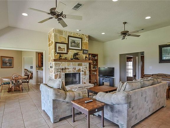 WONDERFUL OPEN FLOOR PLAN WITH LARGE DEN AND ABUNDANT WINDOWS IN FOUR ROOMS ALONG THE BACK, LETTING IN THE BEAUTIFUL TREED AND RIDGE LINE BEYOND VIEW ON THIS RIVER LOT! LARGE KITCHEN WITH KNOTTED PINE CABINETS & CROSS-GRAIN CUT MESQUITE WOOD FLOORS! HUGE MASTER SUITE WITH ENDEARING VIEWS AND SPACIOUS MASTER BATH WITH CLAW FOOT TUB! LARGE STONE WBFP IN DEN, ADJOINING AN OVER SIZED STUDY WITH BUILT INS! FABULOUS COVERED BACK PORCH FROM WHICH TO ENJOY BIG VIEWS!CIRCLE DRIVE AND OVERSIZED GARAGE WITH ROOM FOR THE GOLF CART!
