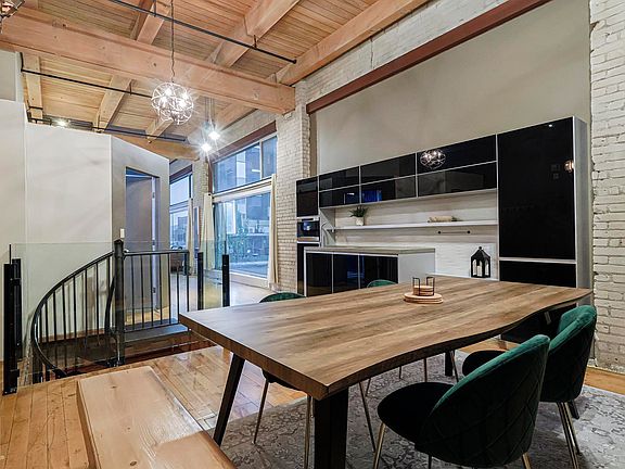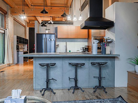MODERN URBAN LOFT STYLE ARCHITECTURE. If your are looking for unique space in the heart of Downtown, this loft is a must see. Over 1,776 sq ft on two levels of fully developed contemporary living space featuring exposed brick, concrete, 13 foot ceilings, hardwood floors, in-suite laundry, and more. Total of two bedrooms, two bathrooms. Stylish kitchen with concrete countertops and modern cabinets. Underground heated and secured parking. Walking distance to hockey arena, restaurants, farmers market, and Ice District with future LRT station conveniently located next to the building.