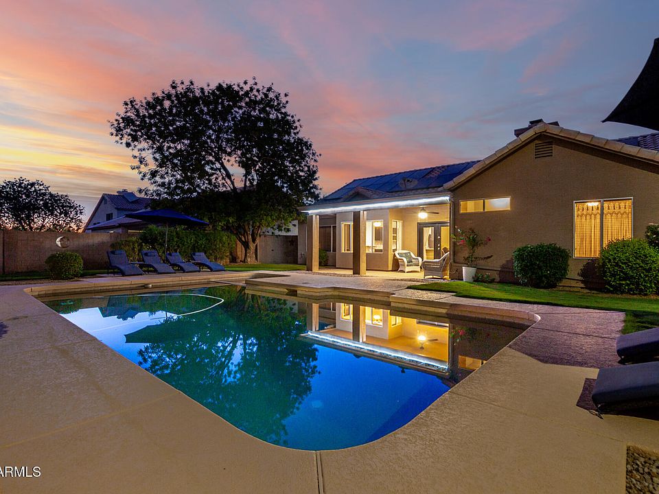 **Paid off solar w/ full price offer. Beautifully maintained, single level home w/ 4 beds, 2 baths & split floor plan w/ 2,111 sqft on oversized cul-de-sac & corner lot backing to a common area for MAX privacy. Inside you will find abundant natural light, vaulted ceilings, plantation shutters, no carpet & fans throughout. The cozy real wood fireplace anchors the family room set against an accent wall w/ built in cabinets, shelving & niche for TV. Kitchen w/ quartz, custom backsplash, newer SS appliances, R/O system & pantry. Formal dining & eat in kitchen overlooking your beautiful backyard! Large diving pool & heated spa w/ real grass yard, mature landscaping, large side yards w/ storage & garden area as well as RV gate! Enjoy the 3 car garage w/ storage & service door to side yard.