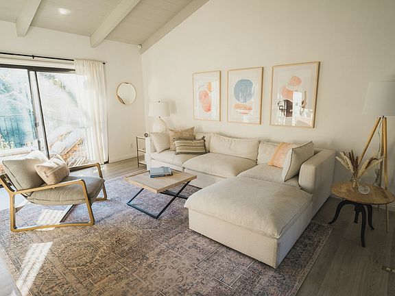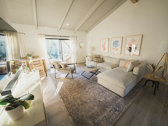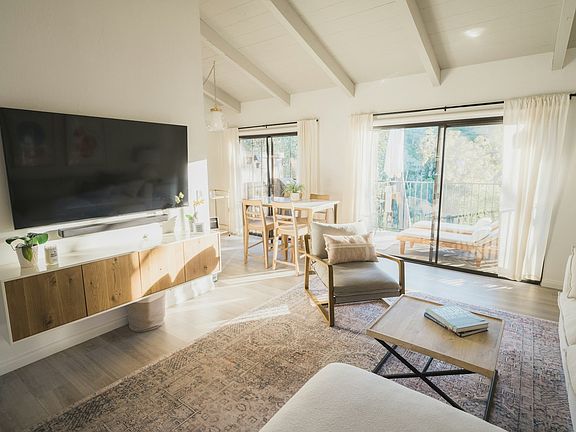 Welcome to this wonderful, private, recently updated 2 bedroom 1.5 bath condo in the Santa Barbara Highlands with an exquisite view. Upon entering this lovely home, you will notice an abundance of natural light flowing in from the two south-facing glass sliding balcony doors, complimenting the living area's impressive exposed beams, vaulted ceiling, and beautiful flooring throughout. From the dining and living area, you arrive onto the charming balcony to a scenic view overlooking the Honda Valley Preserve. This view offers lovely sunsets and magical glimpses of nature. The newly updated kitchen embraces a clean design and showcases gray cabinetry, brass hardware, and all your cooking essentials and appliances. The dining and living areas are perfectly furnished with a large plush couch and a large TV to enjoy! Downstairs, two bedrooms await guests with one king bedroom and one queen bedroom. The washer and dryer are also located downstairs along with a full bath which includes both a bathtub and shower. The Santa Barbara Highlands residents enjoy a community clubhouse, pools, and a spa - all steps from this unit. There is a dedicated covered parking space and public spaces located near the condo. This unit is truly the perfect setting to relax and unwind after a fantastic day enjoying the many nearby beaches, shops, cafes, venues, and parks.