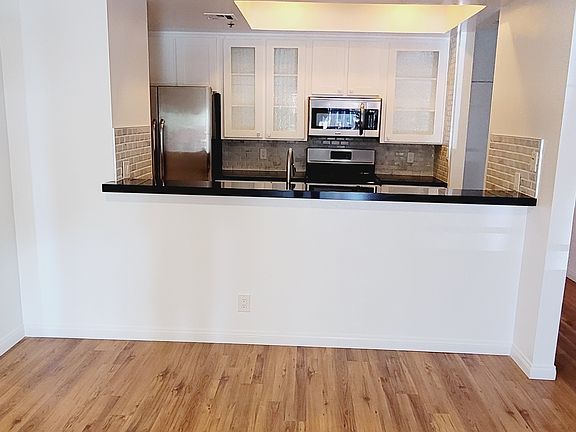 Huge balconyWhite quartz counter-topsStainless steel appliancesWhite wooden cabinetsLots of closet spaceHardwood floorsModern kitchen