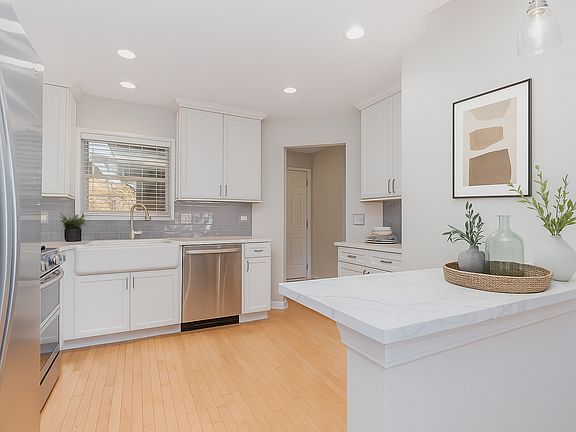 JUST what you've been waiting for!! PRISTINE 3-bedroom, 2.1-bath townhome perfectly situated in a premier interior location! This beautifully updated home showcases a bright, OPEN FLOOR PLAN with soaring ceilings in every bedroom. The STUNNING CUSTOM KITCHEN is a true showstopper-featuring crisp white cabinetry, quartz countertops, stainless steel appliances, and a breakfast bar overlooking the spacious living room with cozy fireplace-ideal for both everyday living and entertaining. Gleaming hardwood floors flow throughout the entire first level, complemented by FRESH PAINT THROUGHOUT, new recessed and designer lighting, and BRAND-NEW CARPET upstairs. The luxurious primary suite offers dramatic vaulted ceilings, two generous closets, and a private bath with double sinks and a separate tub and shower. Two additional bedrooms also feature vaulted ceilings and share a full hall bath. Convenient second-floor laundry hookup (washer/dryer currently in basement). The full basement includes a bathroom rough-in and provides excellent storage or future finishing potential. Step outside and enjoy the beautifully landscaped setting and newer HUGE composite deck-perfect for outdoor entertaining. Complete with a 2-car garage and numerous updates including furnace, A/C, humidifier, sump pump with backup, and smart garage door openers. Impeccably maintained, move-in ready, and ideally located near dining, shopping, and Metra with easy commuter access-this one has it all!