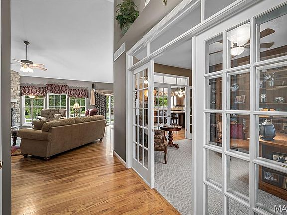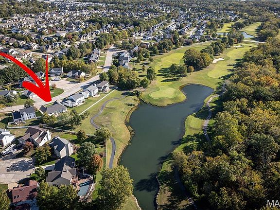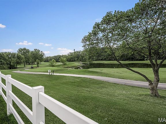 Welcome to unparalleled golf course living! This impeccably maintained, turn-key 3 Bedroom, 2 Bathroom ranch offers a lifestyle of comfort and sophistication, perfectly positioned on a premium lot overlooking the water and the scenic 8th hole of The Falls Golf Course. From the moment you step inside, the hardwood floors and elegant 9' ceilings with crown molding on the main level make a statement. The great room is an entertainer's dream, boasting a vaulted ceiling, a cozy gas fireplace with a stone surround, and a new 9' patio door framing the stunning course view. The Chef's Kitchen is a Masterpiece: Enjoy the custom-designed kitchen featuring beautiful custom cabinetry, granite countertops, a large center island, and a separate wet bar—perfect for entertaining guests after a round of golf. The main floor also includes a dedicated home office with built-in shelving and glass doors, and a spacious laundry room with a folding table and a second pantry closet with a custom closet system. Every detail has been addressed, including custom closet systems and ceiling fans in all bedrooms, and custom bathroom cabinetry. System updates provide peace of mind: a new roof in 2024, new 50 gallon gas water heater in 2024,  and new HVAC in 2020. The Ultimate Lower Level & Garage: The finished basement adds incredible value with a recreation area, a dry bar for game day, and a large cedar closet. Hobbyists will be thrilled with the separate woodworking shop featuring custom Hickory cabinets and built-in 4" PVC ducts, plus an additional dedicated hobby room. The oversized, fully drywalled and insulated 2-car garage includes a workbench, hanging storage, and 220 electric service for your EV. The exterior is as flawless as the interior, featuring an impeccably maintained lawn and professional landscape with a full in-ground sprinkler system. Enjoy the tranquil water and fairway views from your private patio. This is the rare opportunity you've been waiting for—a flawless, updated ranch home in a premier O'Fallon golf community with a neighborhood swimming pool. Don't let this one get away!