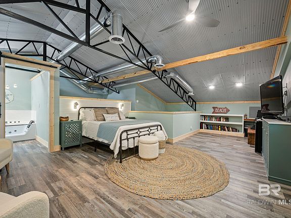 This gorgeous 2 bedroom/2 bath barndominium sits on 4.7 acres with large mature live oaks. Inside enjoy an open concept kitchen, living room and dining room area with pine plank ceilings. Kitchen offers a 6 burner gas stove with griddle cooktop and double oven for those who love to entertain a crowd. There is plenty of storage with a walk-in pantry! First floor bedroom is right off the kitchen with walk-in closet and full bathroom that gives you access outside. Upstairs is the spacious master bedroom with jetted tub, separate shower and large closet. For those who love to garden, the property has raised garden beds and an outdoor shower. Second barn on the property has plenty of space for a boat or tractor. Country living at its finest! Buyer to verify all information during due diligence.