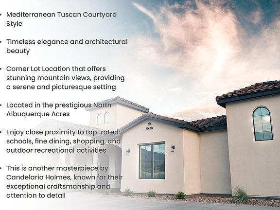 Immerse yourself in luxury living at this unparalleled dream oasis. Crafted with meticulous attention to detail, this custom home offers a blend of opulence and comfort. The grand entrance greets you with exquisite iron work and towering lighting to set the stage, leading to four bedrooms and five spa style baths. Enjoy the waterfall and lovely Sandia Mountains from your patio off the grand den. Stunning chefs kitchen, butler's pantry and formal dining room views. Enjoy the ultimate cinematic experience in the private theater. Entertain in the indoor courtyard with a large screen and outdoor kitchen. The massive 4-car garage includes heated and cooled flex space for gym, workshop or holiday storage. Located in coveted North Albuquerque Acres, this estate offers a lifestyle you deserve!