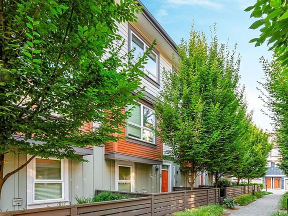 This 1,295sf, 3-level townhouse features 3 bedrooms and 2.5 bathrooms. At the front entrance, a fenced patio with concrete tiles, trees, and shrubs creates a welcoming outdoor space. The ground floor includes the foyer, closet, utilities room, and double attached garage. The main floor offers a spacious open-plan living area with laminate floors. The living room and dining area are bright, while the gourmet kitchen boasts three sides of two-toned cabinets, pendant lights, tiled backsplash, stone countertops, and stainless steel appliances including a gas range. A breakfast nook and powder room complete this level. Upstairs are 3 bedrooms, 2 bathrooms, and laundry. The primary ensuite includes double sinks and a walk-in shower. Geothermal heating/cooling system included.