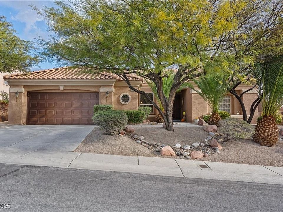 Beautiful single-story home in Sun City Summerlin’s 55+ golf community featuring elegant finishes and a spacious open layout. Enjoy a great room with fireplace and custom entertainment wall, granite countertops, tile flooring, high-grade carpet, and 8” crown molding. The music/media room offers dimmable lighting, and the primary suite includes dual vanities, a soaking tub, shower, and large walk-in closet with dressing room. A private office/library with custom oak built-ins adds versatility. The backyard is a tranquil retreat with mature landscaping, two fountains, decorative planters, and a full patio cover. Updated systems include two newer AC units, two furnaces, two skylights, and fresh exterior paint. Resort-style amenities nearby-golf, pools, fitness, and more!