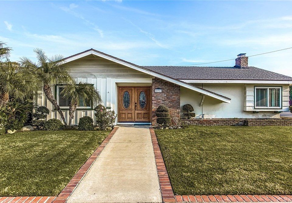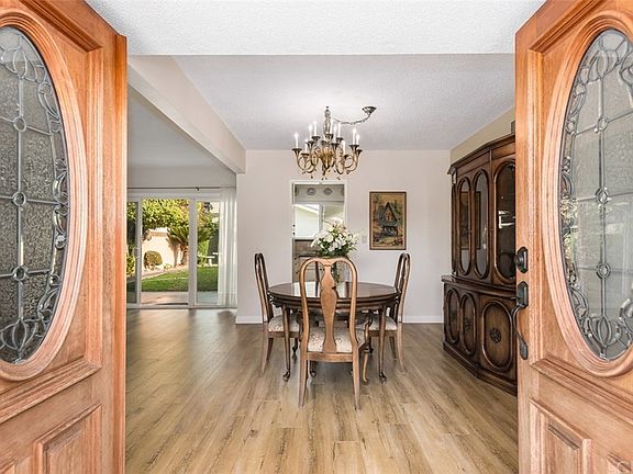 Charming single story home showcases 3 large bedrooms and 2 bathrooms. The double wood entry doors include glass inserts and welcome you to an open living room and dining room. The living room looks out through an updated dual pane glass slider to the beautiful yard full of greenery and patio area for entertaining or just enjoying the scenery. The family room is adjacent to the kitchen has ceiling fan, windows with wood shutters and a cozy white brick fireplace. Remodeled Kitchen with beautiful wood cabinetry, stainless steel appliances and recessed Lighting. Indoor Laundry room just off of kitchen with built-in cabinets and door access to backyard and detached 2 car Garage. Laminate wood floors throughout with tile floors in bathrooms. Dual pane Windows throughout the home as well. Hall bathroom has an updated vanity and tiled shower with tub. All three Bedrooms include ceiling fans. Master bedroom has lots of natural light coming through the dual pane glass slider which overlooks and allows access to the backyard. Master bathroom adjacent to the Master bedroom bath includes dual sinks with large mirror, shower enclosure, and tile floors.
