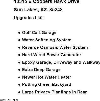 Welcome to your dream home in Sun Lakes, an award-winning community! Enjoy an dual-master floorplan with vaulted ceilings, open concept and an updated kitchen with granite counters and stainless appliances. Outside, relax on the large patio or practice your putting on the green. Upgrades include a water softener and hard-wired generator. Community amenities include golf courses, pools, and tennis courts. Live in luxury and tranquility in this gated resort-style community.