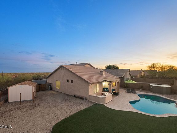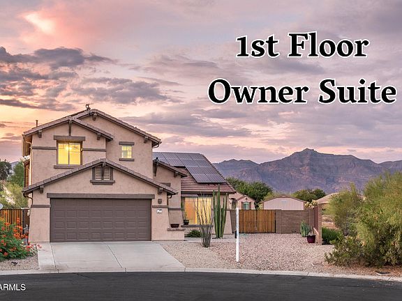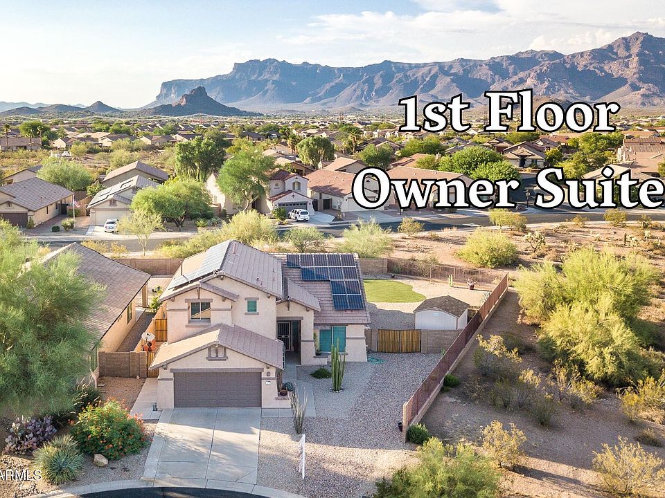WOW! Fantastic Home with ***FIRST FLOOR OWNERS SUITE & DEN*** & RESORT BACK YARD featuring Fabulous HEATED POOL. BBQ Bar, LARGE 9973 sq ft Cul-de-Sac LOT with DOUBLE GATE & Large Storage Shed and ***AWESOME MOUNTAIN VIEWS! ***You'll LOVE the Vaulted Ceilings, OPEN KITCHEN with Granite Counters, Stainless Appliances, Pantry Closet, LARGE ISLAND/Breakfast Bar & ***ENERGY EFFICIENT SOLAR PANELS (producing 42% of energy consumption past 15 mo & solar paid in full)! ***You'll also appreciate the Gas Fireplace, Granite Bathroom Counters, New Wood Laminate Flooring in LR/DR/DEN, Newer Baseboards, Newer Carpet in downstairs Primary Bedroom & EXTERIOR PAINT INCLUDED & Scheduled! ***This POPULAR GATED NEIGHBORHOOD offers LOW HOA FEES of ... $67 per month, including Garbage Service! ***Conveniently Located, close to WORLD CLASS HIKING and the BEAUTIFUL. Canyon Golf Resort, which offers two BREATHTAKING 18-hole Championship golf courses (Dinosaur Mountain and Sidewinder) and Expansive PATIO DINING with amazing golf and mountain views! ***Nature lovers will ENJOY the nearby 2.9 million acres of Tonto National Forest wilderness, hiking, off-road trails plus four beautiful, pristine lakes too! Conveniently located just 35 minutes from Sky Harbor Airport and 20 minutes from Mesa Gateway Airport and San Tan Village Shopping & Dining! ***You'll LOVE the GOLD CANYON LIFESTYLE!