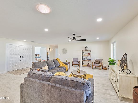 COMPLETELY remodeled Alameda in the beautiful Cottonwood neighborhood of Sun Lakes. This 3 bedroom, 2 bath home has had it all done: Beautiful tile floors, bathrooms, including a spacious master bath with a luxurious soaking tub. All windows and sliders were replaced and are double paned. The open concept kitchen has real wood cabinets, black hardware and striking quartz counters. There is a custom walk in butlers pantry with floor to ceiling shelving complete with space for an additional refrigerator and has an appliance counter. The huge lot deep in the cul-de-sac has a wrap around patio perfect for outdoor gatherings and a large turf section. The brand new HVAC system rounds out this simply move in ready home.