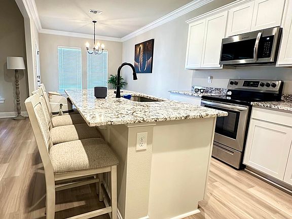Step inside to discover an open floor plan that connects the kitchen, dining, and living areas, making it ideal for both everyday living and entertaining. The kitchen features sleek cabinetry, stainless steel appliances, a center island, and a walk-in pantry, offering both beauty and functionality. The split-bedroom layout provides privacy for the primary suite, which boasts a large walk-in closet and an en-suite bath with dual vanities, a soaking tub, and a separate shower.