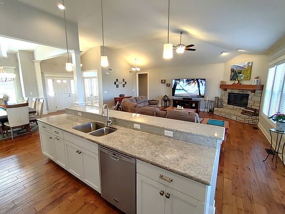 Stone wood burning fireplaceFull finished basementArtificial grassKitchen boasts huge islandOpen concept great roomGranite countertopsOak hardwood floors