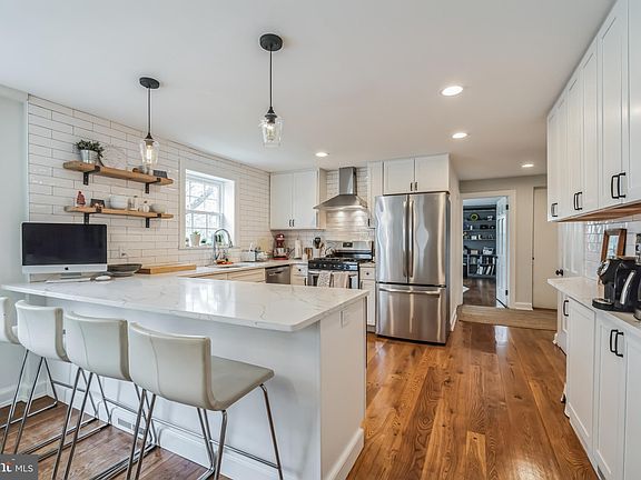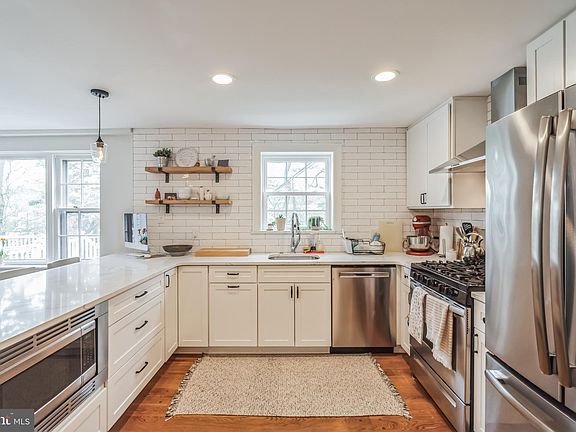 **Back on the market! Showings start at the Open House on SATURDAY, 4/26.** Experience the charm of this meticulously updated 5-bedroom, 4-bathroom cape nestled on a scenic half-acre lot. Revel in picturesque views from both the front and rear of the property. As you step inside, be greeted by oak random width pegged hardwood flooring in the living room, complemented by a chevron marble fireplace surround, recessed lighting, and custom millwork. The dining room boasts beautiful inset cabinets and caged chandelier lighting, leading to a kitchen perfect for entertaining guests. Admire the Calacatta Noble quartz countertop, Shaker cabinets, stainless steel appliances, and ceramic subway tile wall finish. A den with a vintage Malm fireplace and Pella sliders opens to an elevated rear porch with Trex decking. The first floor also features a spacious bedroom with built-in bookcases and a Pottery Barn vanity in the bathroom. Upstairs, find four bedrooms with ample closets and two full bathrooms, including a master bath with a vaulted ceiling and stunning tile finishes. The lower level offers a finished laundry room with vinyl plank flooring, new cabinets, and a bonus/work-out room with its own full bath. Additional upgrades include 200 amp service, new HVAC, plumbing, windows, doors, and landscaping. Located near Abington Friends School, Abington Arts Center, Avelthorpe Park, and local dining and shopping.