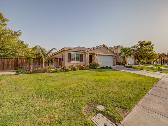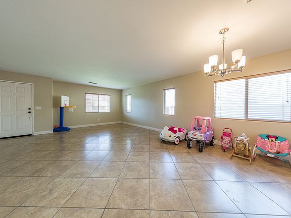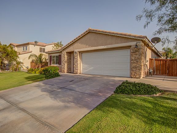 This beautiful single story home has the perfect layout for any need. With the formal entry and living room the flow of the home continues into a formal dining that is separate from the kitchen and family room. The bartop island in the kitchen provides additional seating when entertaining. The home has loads of upgrades including: window blinds, designer wall coverings, ceiling fans, 18" tile flooring, laminate in the bedrooms, a fully landscaped and irrigated backyard with concrete curbing borders, a large concrete patio with concrete walkways that wrap around the perimeter of the home, and epoxied garage floors.