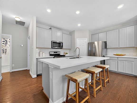 Step into comfort and style in this beautifully maintained single-story home in the desirable Sierra Vista community. Featuring 3 beds and 2 baths, this open-concept layout includes brand-new carpet in all bedrooms, warm wood flooring in main living areas, and a light-filled design perfect for modern living. The kitchen shines with soft gray cabinetry, quartz counters, farmhouse sink, stainless steel appliances, and an oversized island ideal for entertaining. The spacious primary suite offers dual vanities, soaker tub, a walk-in shower and a large walk-in closet. Enjoy upgrades like an epoxy-coated garage floor, 220V EV outlet, and custom entry storage. Out back, a covered patio overlooks the private, fully fenced yard, ideal for relaxing or play. Community perks include resort-style pools, fitness centers, pickleball, playgrounds, scenic trails, and more! With easy access to Hwy 288, commuting to Houston or the Medical Center is a breeze.