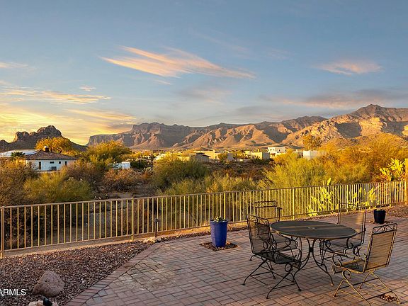 Four car garage, room for an RV, Single Level home perched up with panoramic VIEWS to take in the unobstructed Sunsets VIEWS, Dinosaur Mountain VIEWS and the Superstition Mountain VIEWS on 1 acre with no HOA! This home just underwent a new roof, new tile flooring throughout the inside and also a fresh interior paint job! Besides the four car garage, it also has a detached building good for a workshop, craft room or just extra storage. Lots of concrete driveway space in front of the house with the two driveways and behind the electric side gate to the second two car garage. Plenty of backyard space with multiple patios and easy access if you wanted to add a pool. Come check out this amazing location in the heart of Gold Canyon close to golfing, hiking, mountain biking, and off roading!