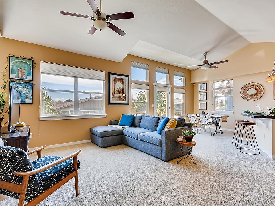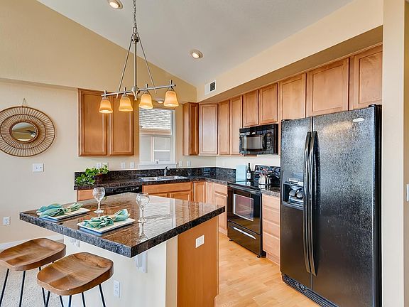 Beautiful and Bright south-facing condo with vaulted ceilings and a wall of windows! Open floor-plan with spacious kitchen island and balcony for entertaining. Oversized 1-car garage with plenty of space for storage, 2 bedrooms with master ensuite and walk-in closet and washer/dryer in-unit. Just blocks away you'll find the light rail, grocery, restaurants, retail, community parks, pools and Stanley Marketplace. A fantastic move-in ready opportunity to live in Stapleton!