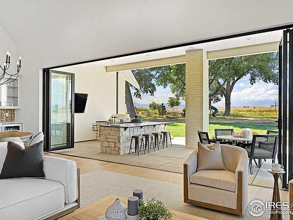 Welcome to a rare fusion of modern European elegance and Colorado farmland serenity. Set on 22 sweeping acres with 10 Class A Shares of Boulder White Rock Ditch, this 2023-built estate delivers a lifestyle as dynamic as it is luxurious. Every detail has been crafted for impact-from the dramatic Austin white stone wall with its now-iconic mantel to the soaring great room where 24-foot panoramic glass doors dissolve into a horizon-wide view of the Rockies.Inside, the home strikes a perfect balance of sophistication and comfort. Four spacious bedrooms, six spa-inspired baths, and playful built-in bunk beds ensure there's space for everyone. Smart living is effortless here with Control4 home automation managing Thermador appliances, climate, and security. The primary suite is a private sanctuary with gauzy, switchable privacy glass, while a hidden wine cellar, secure vault, and custom steel doors add intrigue at every turn.Function meets flair in the details: two laundry rooms for convenience, a half-bath vanity crafted from the property's original cattle corral, and sustainability woven throughout with passive/active solar systems and a brand-new irrigation network-tractor included.Step outside to discover an entertainer's paradise. The outdoor kitchen gleams with stone and quartz counters, drink fridge, firepit, and TV hookups, making it the go-to gathering place. Surrounded by conservation easements (without being tied to one), the property offers uninterrupted privacy and open space in every direction.This isn't just a home-it's a statement. A place where heritage and innovation meet, where wide-open spaces frame mountain vistas, and where modern design creates a legacy for generations. Experience Colorado living at its most vibrant, purposeful, and unforgettable. LIVE BOLDER, LOVE BOULDER!