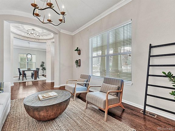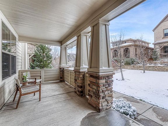 This gorgeous craftsman-style 4br luxury home in Lone Tree has plenty of beautiful contemporary details including heated floors in the master bath, stylish light fixtures, 5-panel wood doors and stunning hardware. A welcoming, covered porch overlooks the grassy common area and is perfect for enjoying a favorite beverage or book. A solid, rich, wood front door opens to a beautiful tile foyer flanked by formal dining and living rooms with gas fireplace and plenty of natural light. The great room layout in the casual side of the home includes a spacious kitchen with wood cabinets, under cabinet lighting, stainless steel appliances, beverage fridge and gas stovetop. A kitchen eating area overlooks a large flagstone patio with firepit in the covered backyard. The family room has an eye-catching gas fireplace with oversized rustic wood beam mantle. Additional beams in the ceiling, ties the rich wood throughout the main floor. A powder room and big laundry room with cabinets, counter space and a sink adds functionality. The 2-car garage with electric car charger off the laundry offers a convenient route from car to kitchen. Upstairs a spacious master suite with dual sink vanity, soaking tub, shower with glass door and 2 shower heads, and walk in closet provide space to relax. An additional 2 bedrooms and a shared bath offer large, light-filled rooms on the upper level. In the finished basement, there is a spacious game/bonus room, additional nonconforming 4th bedroom with an attached bathroom with tile with glass door shower. This level is great for entertaining with plenty of space for a big screen and a projection unit, pool table and more. Sitting within a small community perched on the edge of Bluffs Regional Park, outdoor recreation hiking and bike trails are steps away. Enjoy Lone Tree's theatre, music, dining and shopping in this vibrant community. Easy trips into Denver, DTC or DIA via I-25 or light rail.