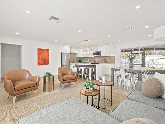 Welcome to this beautifully updated 3-bedroom, 2-bathroom home in Seminole, complete with a 2-car garage and the added peace of mind of being situated outside of a flood zone. From the moment you arrive, you’ll fall in love with the home’s charming curb appeal. Step onto the covered front porch and walk into an inviting interior where an open floor plan seamlessly connects the kitchen, living, and dining areas—perfect for both everyday living and entertaining. The newly renovated kitchen is the heart of the home, featuring a spacious island, brand-new cabinetry, new countertops, and all-new stainless steel appliances. On one side of the home, two comfortable guest bedrooms share a beautifully updated guest bathroom. On the opposite side, enjoy the privacy of a generous primary suite, complete with a large walk-in closet and a sleek, modern en suite bathroom. Relax outdoors on the screened-in, covered back porch, which leads directly to the backyard—ideal for enjoying Florida’s weather year-round. The laundry area, conveniently located in the garage, adds extra functionality, while the 2017 water heater, 2018 roof, and 2020 HVAC provide added confidence and comfort. All of this is located less than 10 minutes from the beach, under 20 minutes to Downtown St. Pete, and close to fantastic restaurants, shops, and amenities. This Seminole gem is truly move-in ready—don’t miss the opportunity to make it yours!