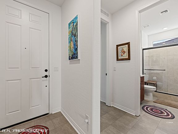 Embrace Mid-century Modern Design! Mid-Century Modern Inspired Bellwood Floorplan! This stunning and rare Bellwood floorplan offers a sophisticated nod to mid-century modern design while embracing today's luxury finishes. The home features a striking 2-inch quartz waterfall island, 8-foot interior doors, and multi-panel sliding glass doors that create seamless indoor-outdoor living. Inside, you'll find modern LVP flooring throughout, dual tiled showers, and bold black fixtures accented by a stylish hexagon backsplash in chef's Kitchen. Flat-panel cabinetry adds a clean, contemporary touch, while custom landscaping enhances the home's curb appeal and outdoor spaces. Golf Cart Garage is an added bonus along with Air-Conditioned main Garage. A truly unique home for a unique individual-perfectly blending timeless design with modern comfort.