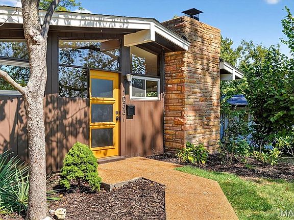 Welcome to this charming 1953 Ralph Fournier Ridgewood mid-century home, thoughtfully updated while maintaining its character. The main level offers a bright living room with wood floors and a cozy wood-burning fireplace, a separate dining area, and a beautifully renovated kitchen with quartzite countertops, stainless steel appliances, ample cabinetry, and original wood paneling. Off the kitchen you will find direct access to the attached carport and patio perfect for morning coffee, entertaining and easy access to the large backyard. Convenient access to a laundry/storage and utility area is found down the hall. The primary suite features a spacious closet and an ensuite bath with heated floors and a shower/tub combo. Three additional bedrooms share a newly updated hall bath with a walk-in shower, and both bathrooms showcase authentic terrazzo flooring. Outdoors, enjoy a spacious backyard retreat with a new exposed aggregate concrete patio and driveway, raised garden beds, a storage shed, fire pit, and generous side yard. With new windows throughout and a brand-new roof updated in 2025, this home offers peace of mind, comfort, and style, all tucked away on a cul-de-sac near parks, schools, shopping, and highways as well as within the Lindbergh school district.