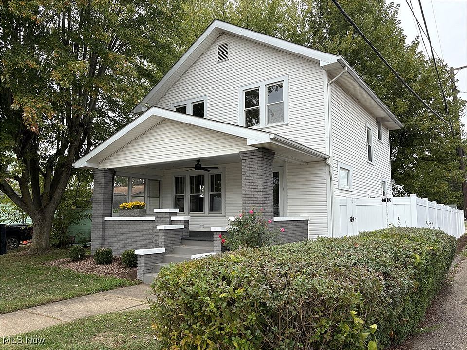 Beautifully updated 3 bedroom vinyl sided home. Inviting covered front porch with ceiling fan. Original woodwork throughout. Freshly painted with new floor coverings and new light fixtures throughout. New white cabinets, counters and stainless steel sink in kitchen with new stainless steel gas range. Kitchen opens to a breakfast nook. Large built in cabinet in the 2nd floor hallway with updated full bath. Private, vinyl fence enclosed backyard with patio. 2 car detached garage. Move in ready, offering immediate possession. Agent owned.