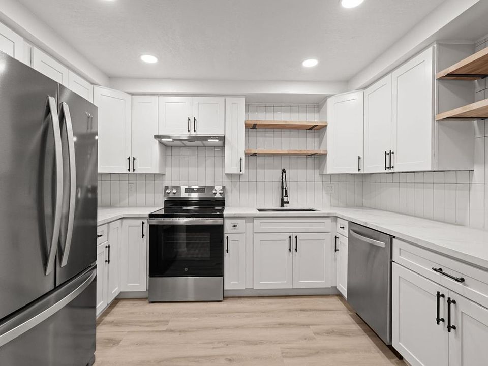 Oversized private balconySoft natural lightWarm inviting feelNew flooringQuartz countertopsRedesigned kitchenNew stainless steel appliances