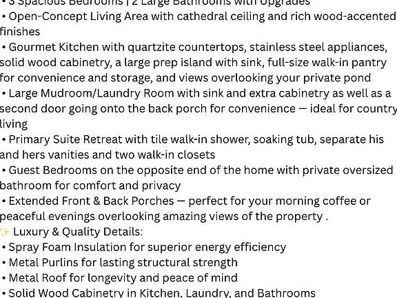 This 3/2 CUSTOM New Home is one of only two homes left in this planned country community, perfectly blending luxury craftsmanship with wide-open Texas living. Enjoy space to raise animals, watch sunsets over your pond, and relax under the stars, all from your own 22-acre retreat. A Full Detailed Page of Facts and Description of this home is attached due to there not being enough space here to include EVERYTHING this home has to Offer. Please take a look at the attachments to read the full description of this Fabulous Home and All the Upgrades.