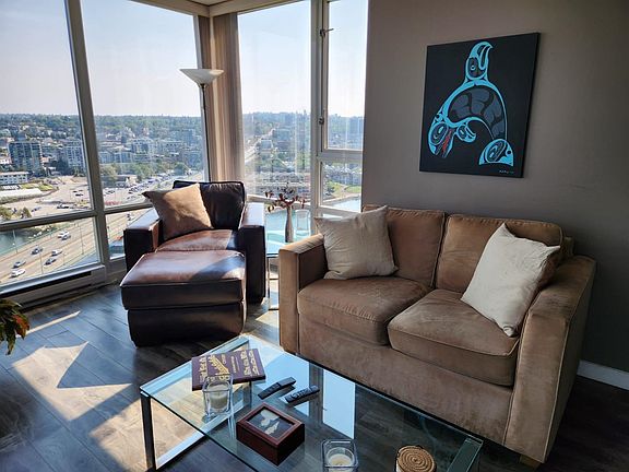 Perched on the 28th floor in Yaletown, this 1-bed + office home offers stunning panoramic views of False Creek, the city, and the North Shore Mountains. Tastefully furnished with floor-to-ceiling windows, hardwood floors, and comfortable seating. Enjoy sunrise coffee on the balcony. The den doubles as a home office with a view. Available till May. Amenities include 24-hour concierge, indoor pool, gym, hot tub, sauna, and steam room. WIFI and utilities included. Pets considered.