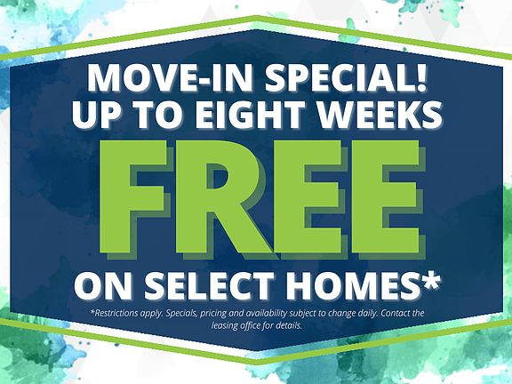 - Special offer! Move-in Special! Up to Eight Weeks Free on select homes! *Restrictions apply. Specials, pricing and availability subject to change daily. Contact the leasing office for details.