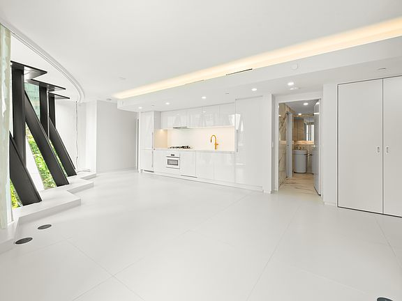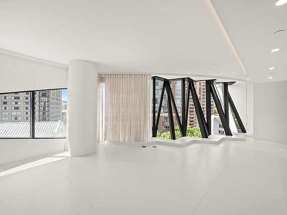 Large white porcelain flooringFloor-to-ceiling sheer draperyCurved glass walls
