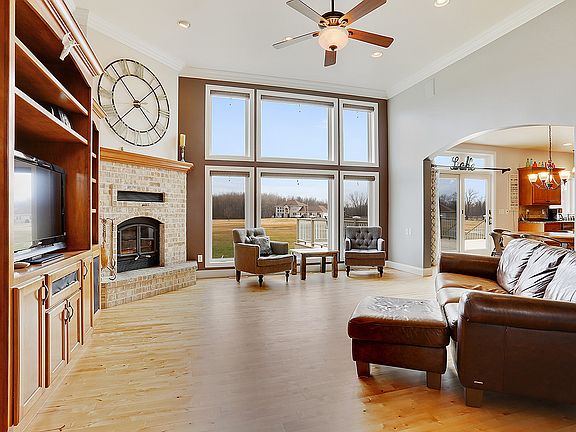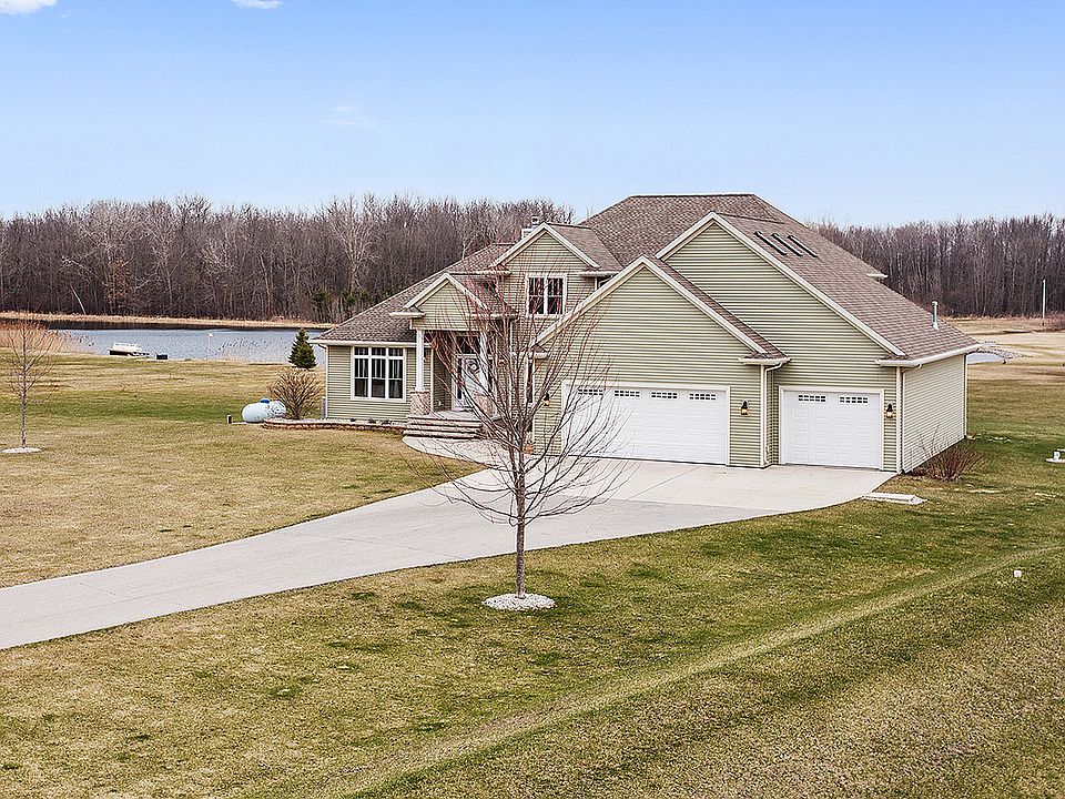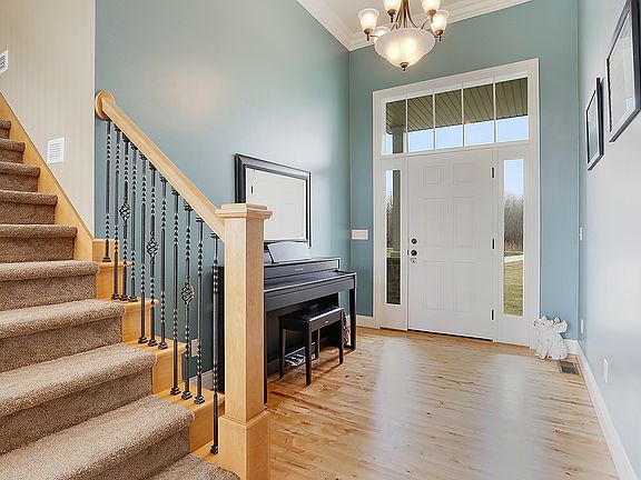 Impressive home on almost 3 acres w/a pond! Features incl 4+ bdrms; HW & ceramic flrs; formal dining rm/office; central vac; surround sound; 1st flr master ste w/dual closets & private bath w/dual sinks & tile shower; bonus rm over garage (possible 5th bdrm); 1st flr lndry; lockers; exposed LL w/full bath. 3+ stall garage has basement access. Spacious landscaped lot. Annual $235 fee for pond mtnce