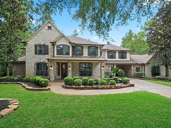 Gorgeous renovation that feels like new on a lush forested acre of privacy. Surrounded by beautiful majestic trees. Within a gated enclave of upscale acreage estates where trees are protected. Tall windows showcase the extraordinary views. Ultra spacious plan designed for extravagant living & the happy expectation of entertaining. Quartz counters. Wood floors. Large form tile. Luxe Primary offers a soaking tub, large shower & dual closets. Flex Sunroom on the 1st Floor. New outdoor kitchen: gas grill/burners. Gameroom up with refreshment bar. All large bedrooms with walk-in closets +Guest Suite. Unique design lets you unload groceries/passengers under a Porte Cochere. Huge 5-Car Motor/Sports Ct w/back entry Garage. Relax in the quiet solitude; no visible back neighbors. 20 ft of natural forest is retained on the sides & back of lots for 40 ft of privacy between neighbors. 2 Fishing Lakes*Paved Trails*Playground*Park. 1.6 miles to I-45 dining/shopping. The Woodlands 15 min.