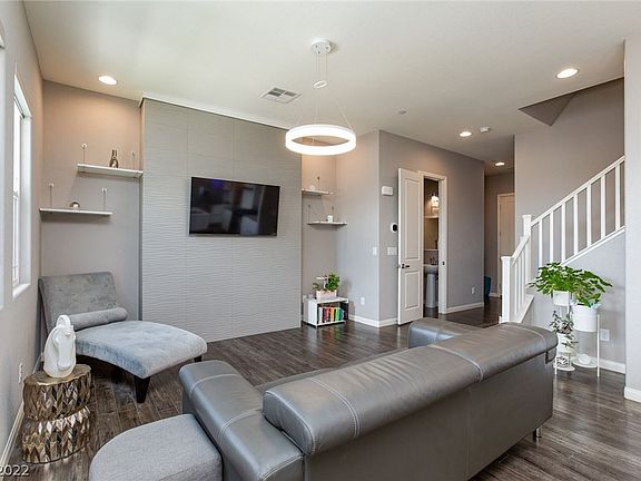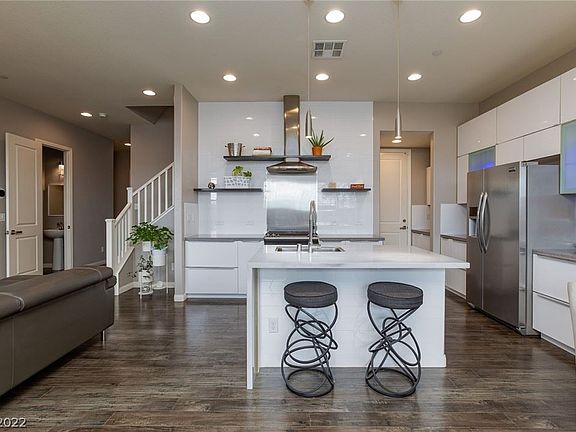 Wow! Stunning two-story townhome in Summerlin South; 3 bedrooms upstairs; 2 full baths upstairs & half bath downstairs; upstairs laundry room; 2-car garage with electric car hookup; first level is entirely open concept with 10' high ceilings & lots of natural light; contemporary kitchen with marble island, quartz countertops, stainless steel appliances, custom cabinets & walk-in pantry; high-end laminate flooring & tile throughout; low-maintenance backyard with covered patio, elegant water feature & synthetic turf; custom finishes throughout (accent walls, floating nightstands, built-in closets, primary walk-in shower with additional shower jets); this gated neighborhood offers a resort-style community pool, cabanas, outdoor lounge, and 24/7 fitness room. Great location! Convenient to 215 freeway, dining/retail, nearby parks, great schools, and Downtown Summerlin. This beautiful home can be yours, schedule your showing today!