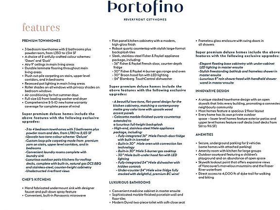 Discover luxury riverside living at Parc Portofino with this rare corner townhome facing west and east, plus south-facing windows for all-day light. Enjoy 1,514 sqft of indoor space and a 611 sqft private rooftop terrace—perfect for entertaining. No future 6-story buildings will block your west-facing view. This 3 bed, 2.5 bath air-conditioned home features 9-ft ceilings, premium Fisher & Paykel appliances, designer finishes, and a chef’s kitchen. Located steps from the 4,000 ft dyke trail, parks, and schools, with underground parking and luxury amenities. Estimated completion: Nov 2025.
