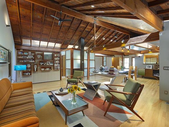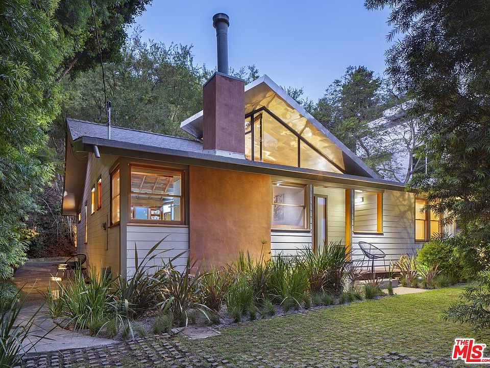 The Mahler / Adams Residence, 1924-1998, William Adams, Architect. The published studio / home of sculptor Anna Mahler, daughter of Austrian composer Gustav Mahler, is a remarkable demonstration of Mies van der Rohe's adage: Less is more. While memorializing them in the new floor surface in deference to Mahler, Adams daringly removed living room, dining room, kitchen, bedroom walls, and ceilings creating an inspiring new space for modern living. The new open plan features spacious high-ceilinged living/dining space with fireplace. Remodeled kitchen with stainless appliances and a corner banquette. A primary bedroom with en suite bathroom, and walk-in closet with handcrafted Mortise & Tenon cabinetry. The second bedroom can also function as an office and opens directly to the private exterior and into nature. A party-sized sundeck, sheltered by a canopy of shade trees, adorns the hillside, and affords wide views of the surrounding canyon, making it the perfect place to unwind or host friends. The front yard includes a parking pad as well as carport for two cars. Situated in sylvan Beverly Glen, with the prestigious Bel Air zip code, The Mahler / Adams Residence offers an artful blend of rich, bohemian history and warm contemporary architectural significance.