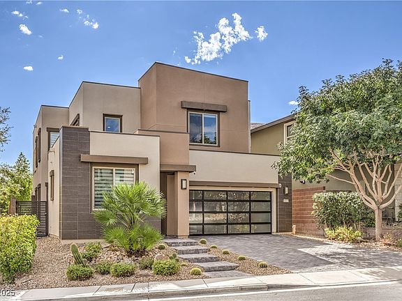 You don't want to miss this sleek, modern, open concept home located in the Cliffs Village of Summerlin South. Bright living space with vaulted ceilings, floating staircase, custom feature walls, and stacking sliding doors providing a fresh indoor/outdoor feel. The chef's kitchen features an oversized quartzite island with waterfall edges, spacious pantry, and stainless steel appliances. The primary bedroom suite is your privet retreat complete with dual sinks, oversized shower, and separate closets for ultimate convenience. Enjoy outdoor entertaining with a Custom Built-In BBQ Grill, Gas Fireplace, Fire Pit & Contemporary Heated Pool/Spa with views of the community park, city, and mountains. Live just minutes from Bishop Gorman High School, walking trails, dining, shopping & Downtown Summerlin. A MUST SEE!!!