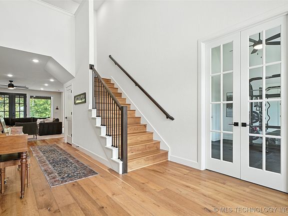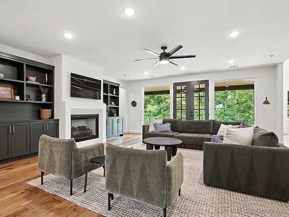 Gorgeous timeless design, soaring ceilings, and beautiful natural light throughout this better-than-new home in gated Riverview Park Estates; Jenks Southeast schools! This stunning home features a flexible floor plan with plenty of options to suit your needs. The main floor boasts an office, living room open to eat-in kitchen with a massive walk-in pantry, primary suite, powder bath, drop zone mudroom plus a storm shelter; open game room, three bedrooms, two full bathrooms and a bonus room with a closet that could be used as a second home office or fifth bedroom upstairs. Covered outdoor living with a fireplace, retractable screens and plenty of space for a dining area. Charming crushed gravel patio with a garden and additional space to lounge and entertain. Enjoy private, gated access and a community pool.