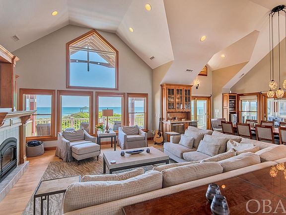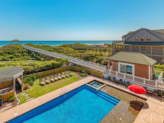 Surrounded by a beautifully landscaped yard, and referenced by Dare County Tax records as a: "Modern Oceanfront Estate."... it would take pages to describe just how incredible this 8 bedroom, 8 bath, oceanfront home is. The open living area with a vaulted ceiling is perfect for visiting with family and friends. Hoping for an updated kitchen that's tastefully designed? This house has it! Quartz countertops, a substantial island, sub-zero refrigerator, gas range with hood and plenty of storage. Step out from the lovely dining area into a large screened-in porch with a built-in gas grill with an exhaust hood and an additional table for dining. From the porch you can see the sound to the west and the ocean to the east. While looking out at the ocean (from one of the multiple decks), your eyes will find the oversized pool (28 x 46) that includes a hot tub, kiddie pool and baja shelf for relaxing in lounge chairs. There is also an outdoor brick fireplace to enjoy for the chilly beach evenings. For those who like to work-out before hitting the beach, no problem...there's an out building with exercise equipment. Other amenities include a theatre room, a hot tub located on the mid-level deck, a recreation room on the ground floor and multiple large screen TV's throughout the house. If you're stuck doing laundry, you can be done in no time as there are 3 (yes, 3!) sets of washers and dryers. The bedrooms are spacious and the bathrooms are elegant. Other property details include an elevator to all 3 levels, mechanical shades, ice machine, and even a boardwalk to your very own gazebo that leads directly to the beach! This property is only 1.8 miles from the Hatteras National Seashore. Let your dreams begin now!