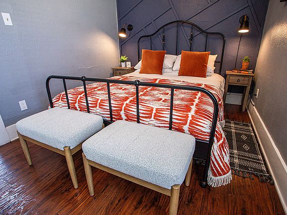 The bedroom offers a queen size bed, portable AC, fresh linens and a side table with lamps.